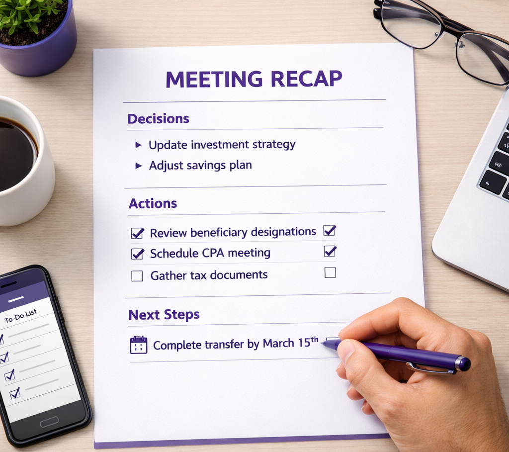 Actions (up to three): Write actions as clear commitments that start with a verb, not as vague reminders. Assign one owner to each action. Add a date or a clear trigger so everyone knows when the step is done. Example: Review beneficiary designations and send updates by Friday (Client).